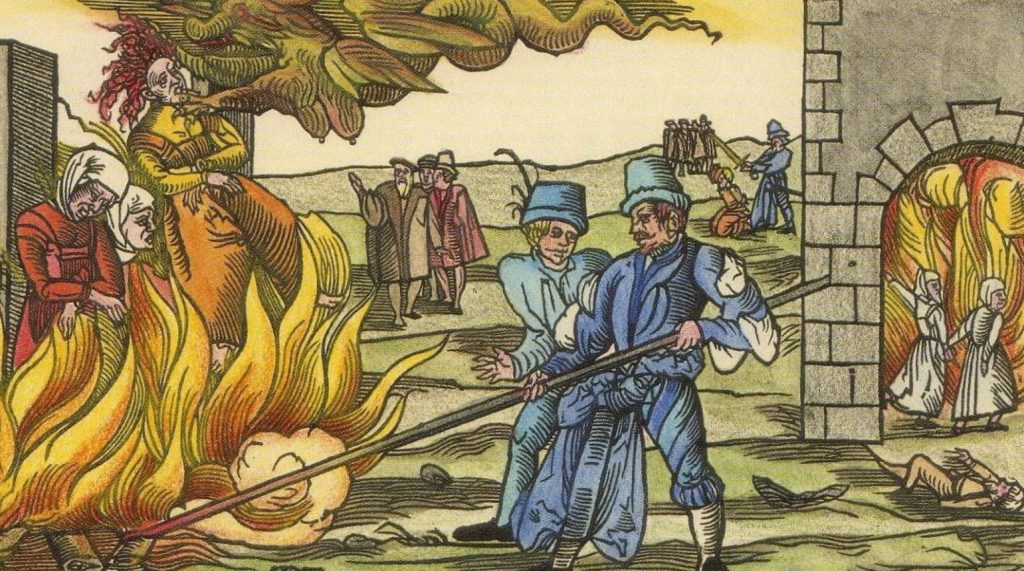 Grafika z ulotki z 1555 roku informująca o spaleniu na stosie trzech czarodziejek, fot. Wikipedia
