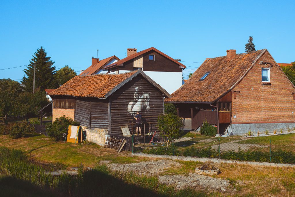 Arkadiusz Andrejkow był wyborem oczywistym. Ten mistrz deskali zasłynął na Podkarpaciu, gdzie na starych szopach i stodołach maluje portrety dawnych mieszkańców, tworząc swoisty „Cichy memoriał”. Jego prace wyglądają jak żywe – postaci zdają się niemal wychodzić z desek. Co więcej, potrafi wyczarować taki obraz w jeden dzień. Do tego Andrejkow zakochał się w Warmii. Wcześniej jej nie znał – z Sanoka to przecież wyprawa na drugi koniec świata – ale jak raz przyjechał, to przepadł. Wracał tu z radością, czasem nawet malował „w prezencie”, oczarowany lokalnym klimatem i pasją ludzi. Większość deskali powstała jednak dzięki internetowym zbiórkom. Andrejkow jednak stworzył wiejską galerię, którą można zobaczyć w plenerze, za darmo i o każdej porze.