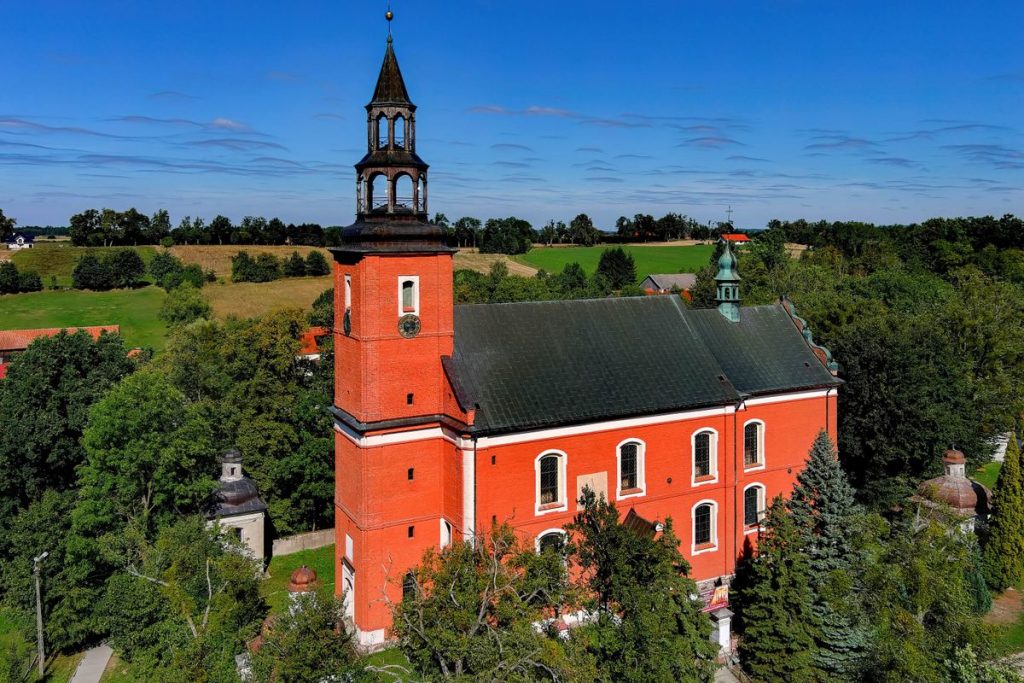 Zachwyca również kościół obok kalwarii. Jednonawowy, z wieżą i zegarami słonecznymi. Wieża z neobarokowym hełmem z 1854 roku.