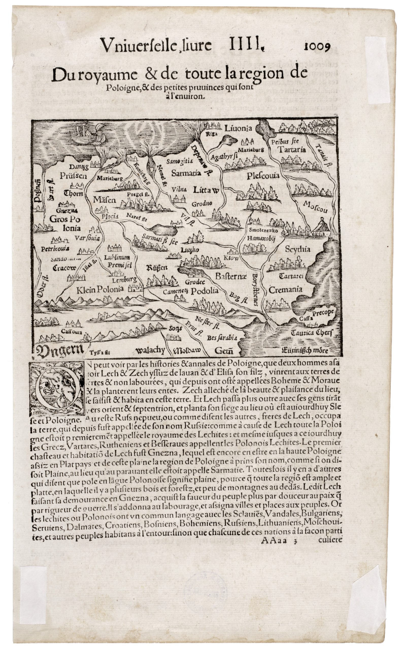 W centralnej części u góry widnieje napis: „Vniuerselle IIII”, z prawej strony numeracja: pagina 1009, a poniżej intrygująca inskrypcja: Du royaume & de toute la region de Poloigne, & des petites pruuinces qui sont à l’enuiron („O królestwie i całym regionie Polski oraz małych prowincjach wokół niej”).