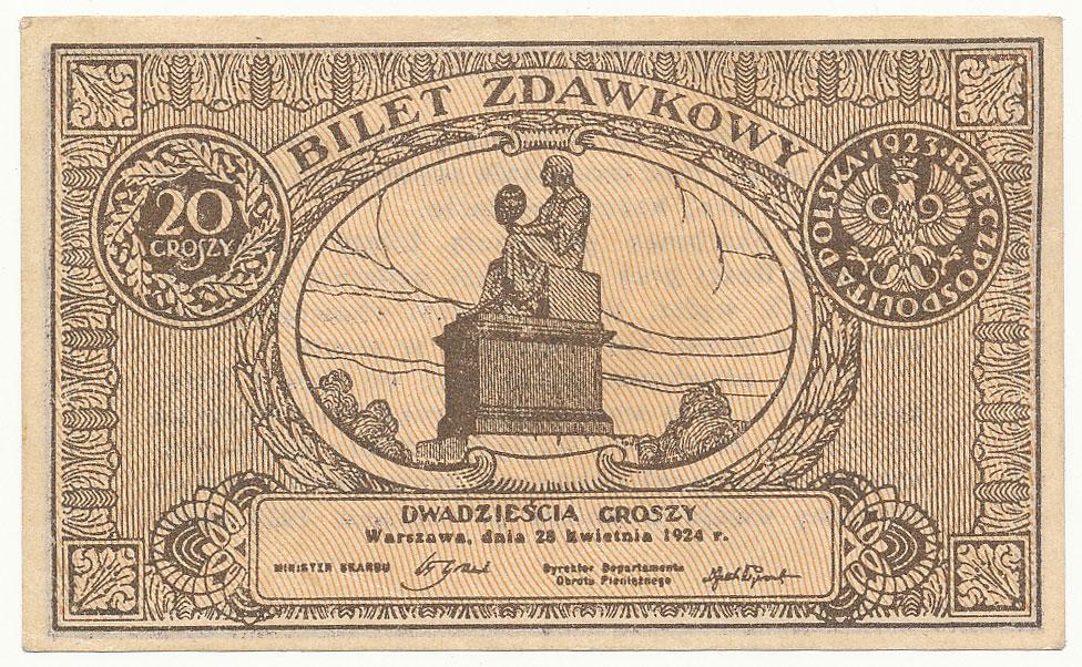 Wizerunek astronoma można znaleźć też na bilecie zdawkowym o nominale 20 groszy, wydanym 28 kwietnia 1924 roku. Bilety zdawkowe stanowiły substytut bilonu, czyli przejściowo zastępowały drobne monety, i były emitowane przez Skarb Państwa. Na przedniej stronie biletu o nominale 20 groszy wyeksponowano warszawski pomnik astronoma, odsłonięty w maju 1830 roku przed gmachem Towarzystwa Przyjaciół Nauk.