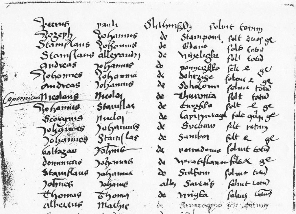 W 1491 roku, tuż przed odkryciem Ameryki przez Kolumba, Mikołaj wraz z bratem Andrzejem zapisali się na Akademię, wpłacając czesne do kwestury. W księdze przyjęć z semestru zimowego 1491/1492 znajduje się zapis: „Nicolaus Nicolai de Thuronia solvit totum”, co oznacza: „Mikołaj syn Mikołaja z Torunia zapłacił wszystko”.