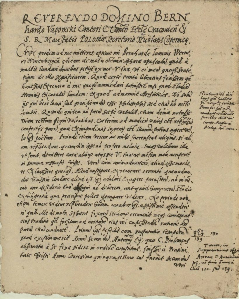 „Najsłynniejszym” jednak listem Kopernika jest ten napisany 3 czerwca 1524 roku do Bernarda Wapowskiego, królewskiego sekretarza i kartografa. Właśnie w tym dokumencie Kopernik krytykuje teorie Johannesa Wernera, wybitnego matematyka z Norymbergi.