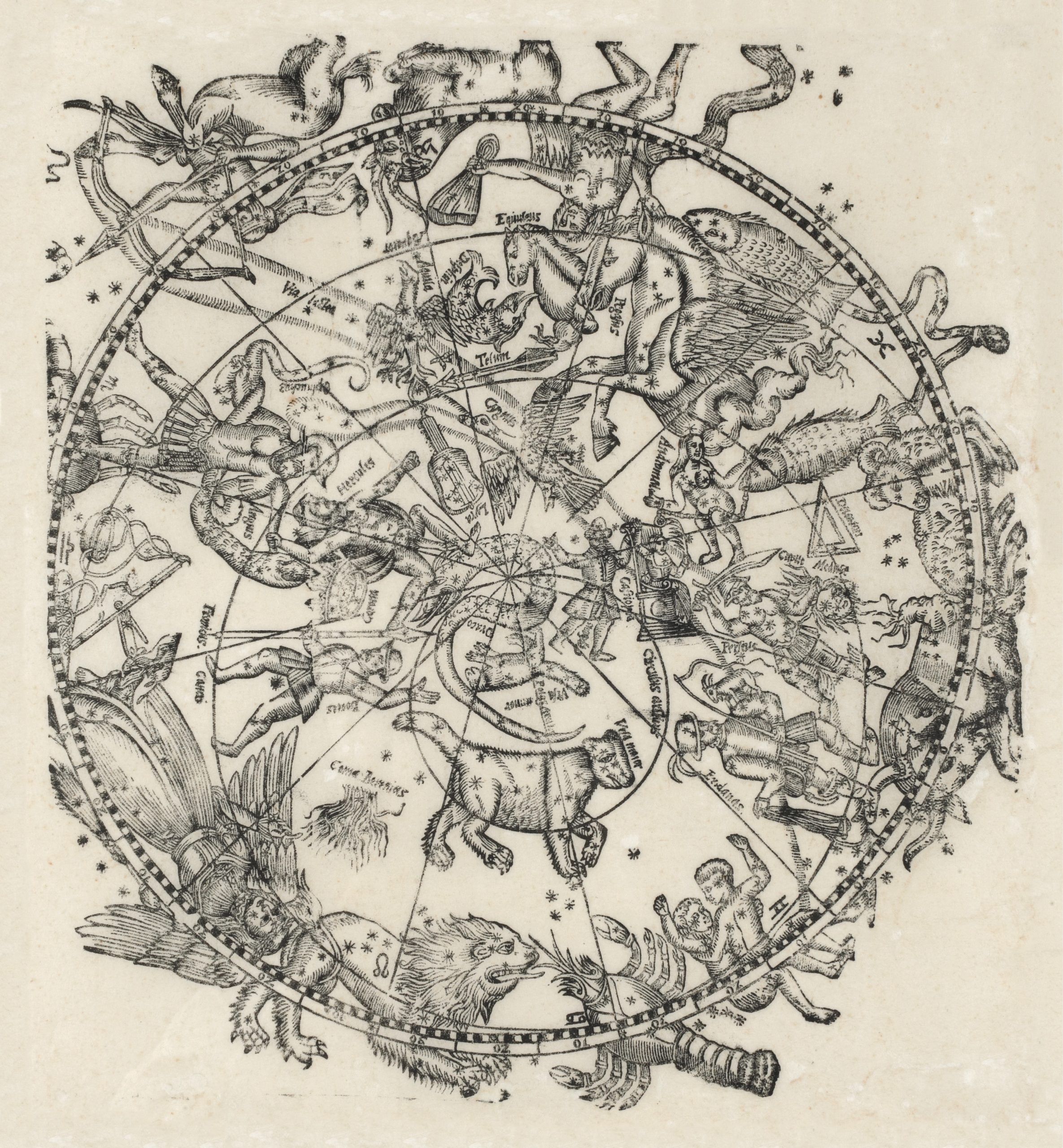 Najstarsza polska mapa nieba. Ilustracja do dzieła Phaenomena albo wyraz znaków niebieskich Jana Kochanowskiego. Drzeworyt, Polska, XVI w.