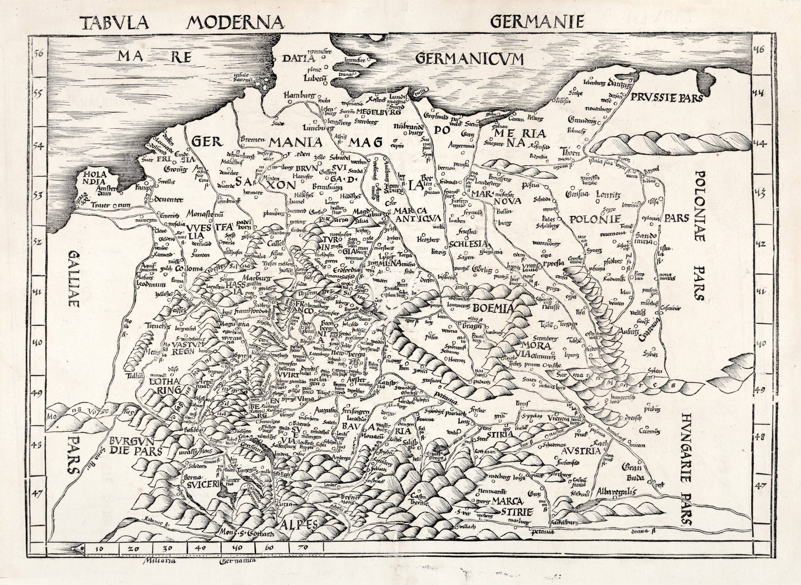 Jedna z najstarszych znanych map, które przedstawiają ziemie polskie – Tabula Moderna Germaniae autorstwa Martina Waldseemüllera (1472–1518). Powstała jako część słynnego wydania Geografii Klaudiusza Ptolemeusza, opublikowanego w Strasburgu w 1513 roku. W ramach tego wydania Waldseemüller opracował dodatek składający się z dwudziestu nowoczesnych map – Tabulae Modernae – które uwzględniały najnowsze odkrycia i osiągnięcia ówczesnej kartografii.