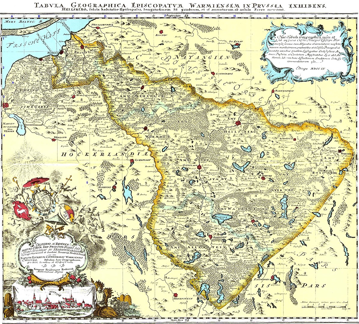 Mapa została sporządzona w dwóch wersjach. Pierwsza, zawierająca błąd w tytulaturze kapituły warmińskiej, została przez nią odrzucona. Dopiero po wprowadzeniu poprawek mapa została przyjęta. Dzieło nosi tytuł Tabula Geographica Episcopatum Warmiensem In Prussia Exhibens i zostało wydane w Elblągu w 1755 roku. Mapa, wykonana w skali 1:226 000, miała wymiary 570 × 505 mm i zawierała 821 nazw miejscowości, z czego 576 znajdowało się na Warmii. Jak na połowę XVIII wieku, była niezwykle dokładna, z precyzyjnie zaznaczonymi granicami Warmii.