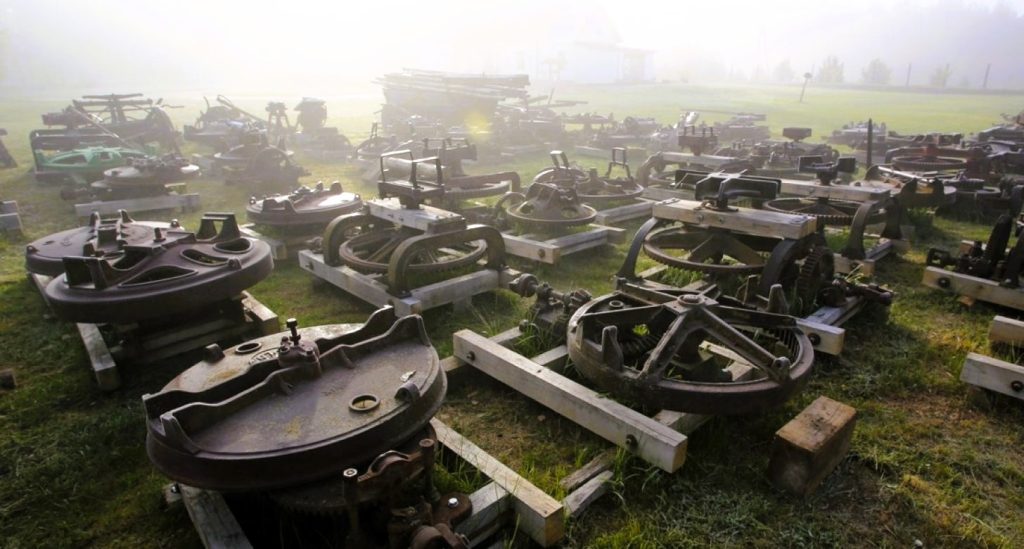 - Każdy z nich waży 300–400 kilogramów. Może nawet pięćset kilo. Czasami, jak widzę znajomego z widzenia, który na naszej ulicy zbiera złom, pytam go o ceny żeliwa. Mówi, że nie muszę się martwić. Że jeśli coś mam, to on przyjedzie tym właśnie wózkiem i wszystko weźmie. Śmieję się wtedy pod nosem, że raczej nie dałby rady za jednym zamachem — przyznaje pan Janusz. — wyzbierałem wszystkie kieraty i maszyny, jakie się tutaj znajdowały. Warmia i Mazury to były typowo rolnicze krainy. W małych miasteczkach wszędzie były odlewnie żeliwa produkujące sieczkarnie, młockarnie i oczywiście kieraty. Dlatego było tego tu dużo. Stały zapomniane gdzieś za stodołami. Często porastał je mech. Pamiętam, że jak jechałem kiedyś przez jakąś wieś i widziałem zapadającą się stodołę, byłem pewny, że za nią, w pokrzywach, znajdę kierat.