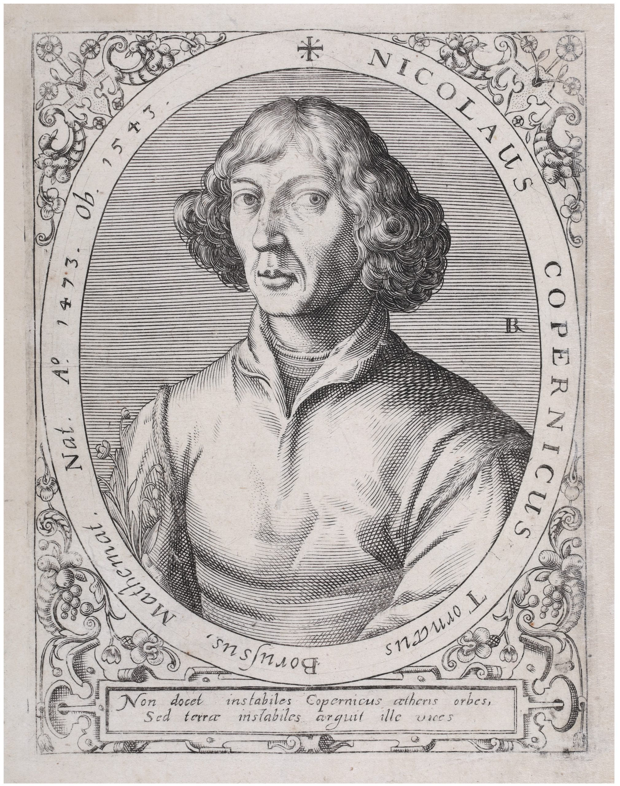 Pod portretem umieszczono poetycką sentencję łacińską: Nox docet instabiles Copernicus aetheris orbes, / Sed terrae instabiles arguit ille vices, co można przetłumaczyć jako: „Noc uczy o zmiennych sferach eteru – Kopernik, / lecz on sam dowodzi zmienności ziemskich losów.”