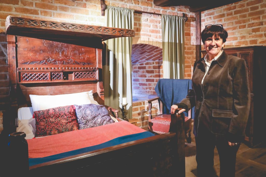 - Na zagłowiu późnogotyckiego łoża, które znajduje się w naszej muzealnej sypialni, widnieje pięknie rzeźbiona scena, którą można kojarzyć z legendą o świętym Eustachym. Zgodnie z tą opowieścią, podczas polowania świętemu Eustachemu ukazał się Chrystus, pojawiający się między rogami jelenia – dodaje Jagoda Semków. — Choć to nie jest łóżko Kopernika, nie możemy wykluczyć, że mógł spać na podobnym. Na łożu ułożona jest pościel, składająca się z kilku warstw poduch, które zapewniają komfort snu w pozycji półleżącej. A czym się wówczas okrywano? Prości ludzie wypełniali poduszki i pierzyny sianem, słomą lub mchem, podczas gdy zamożniejsi mogli sobie pozwolić na pierze. Początkowo nakrywano się także skórami, które zapewniały odpowiednią temperaturę. Poduchy i pierzyny powlekano naturalnymi tkaninami, najczęściej z wełny lub bawełny, barwionymi w popularne wówczas kolory. W pobliżu łoża znajdowało się również naczynie nocne, które umożliwiało załatwienie potrzeby fizjologicznej bez konieczności wychodzenia na zewnątrz. Naczynie, które znajduje się w muzealnej sypialni, przeznaczone było dla mężczyzn i nosiło nazwę urynał.