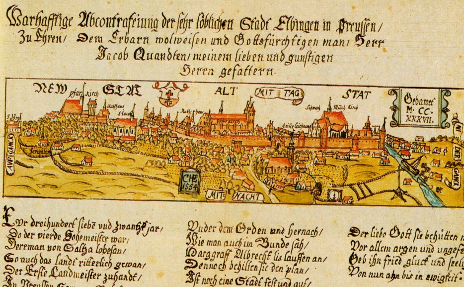 Elbląg został założony w 1237 roku, a prawa miejskie uzyskał w 1246 roku. Gdy Kopernik przyjechał tu po raz pierwszy w styczniu 1504 roku, miasto było już prężnym ośrodkiem. Kopernik towarzyszył wtedy swojemu wujowi biskupowi Łukaszowi Watzenrode. Mieli zabrać głos w naradzie dotyczącej wysłania posłów do polskiego króla, aby ten przybył do Prus. Spotkanie odbyło się ratuszu.