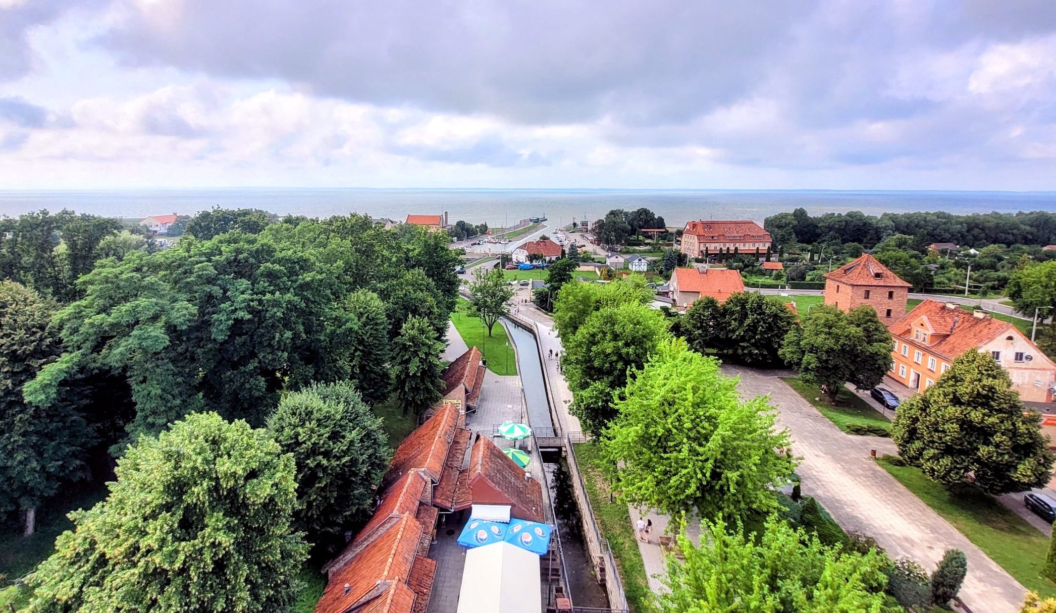Kamera ponownie ukazuje okolice Fromborka z góry. Wzgórze Katedralne z zabudowaniami z czerwonej cegły kontrastuje z Zalewem Wiślanym w oddali. Kolejne ujęcie pokazuje Frombork w szerokim planie.