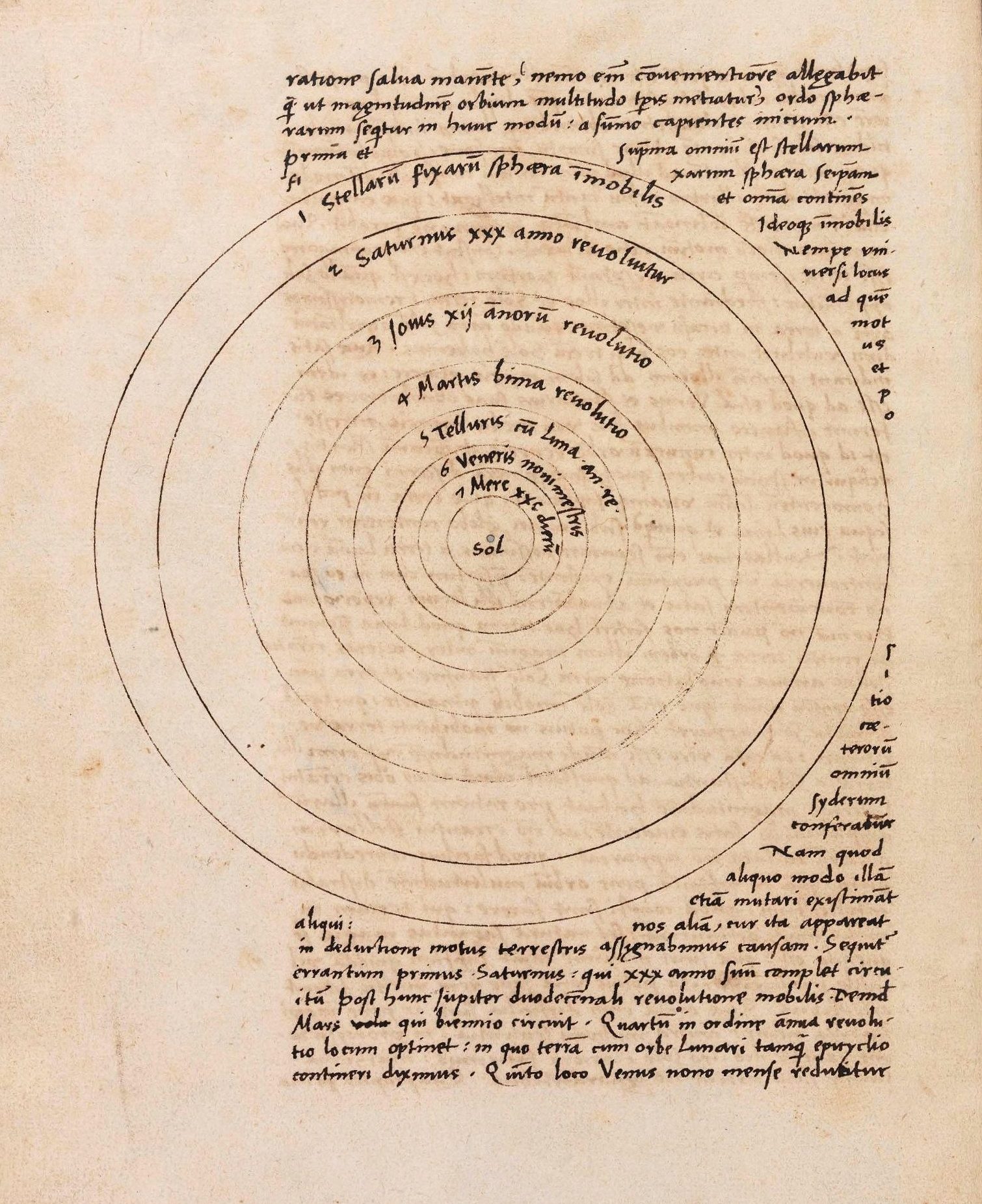 - Pierwszą i najwyższą ze wszystkich jest sfera gwiazd stałych, obejmująca samą siebie oraz cały świat i dlatego nieruchoma, mianowicie jako takie miejsce całości, żeby doń można było odnieść ruch i położenie wszystkich pozostałych ciał niebieskich. Niektórzy sądzą, co prawda, że i ta sfera w jakiś sposób podlega zmienności, ale ja, wyłuszczając ruch Ziemi, inną tego pozornego zjawiska wskazuję przyczynę. Z kolei idzie pierwsza z planet, Saturn, który obiegu swego dopełnia w ciągu trzydziestu lat. Za nim Jowisz, dokonujący obiegu w dwunastu latach. Następnie Mars, który odbywa obieg w ciągu dwu lat. Czwarte miejsce w tym szeregu zajmuje sfera o rocznym obiegu, w której, jak powiedzieliśmy, mieści się Ziemia ze sferą Księżyca jakby małym epicyklem. Na piątym miejscu Wenus powraca do 10 pierwotnego położenia co dziewięć miesięcy. Szóste wreszcie miejsce zajmuje Merkury, odbywający obieg w ciągu osiemdziesięciu dni.